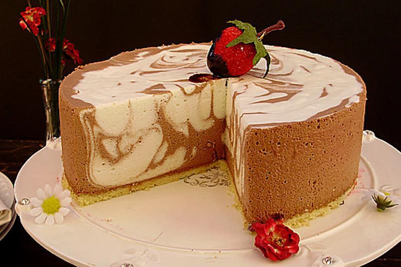 Na biskvit koji ste ostavili u kalupu da se ohladi ulijte tamnu čokoladu i prošarajte bijelom. Stavite u hladnjak (najbolje preko noći, možete čak i jedno sat vremena u zamrzivač, pa preseliti u hladnjak).