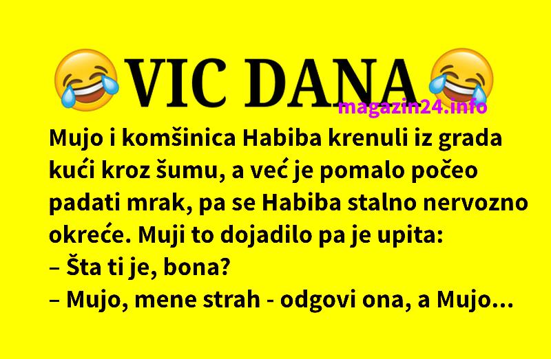 Mujo i komšinica Habiba krenuli iz grada kući kroz šumu, a već je pomalo počeo padati mrak, pa se Habiba stalno nervozno okreće. Muji to dojadilo pa je upita:.