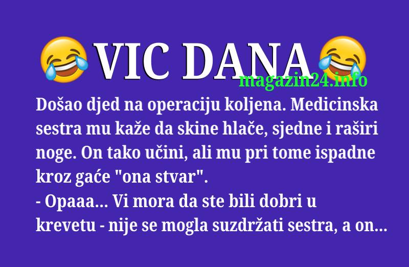 Došao djed u bolnicu operirati koljena. Medicinska sestra mu kaže da skine hlače, sjedne i raširi noge. Djed tako i učini, ali dok je širio noge ispade mu kroz gaće “ona stvar”.